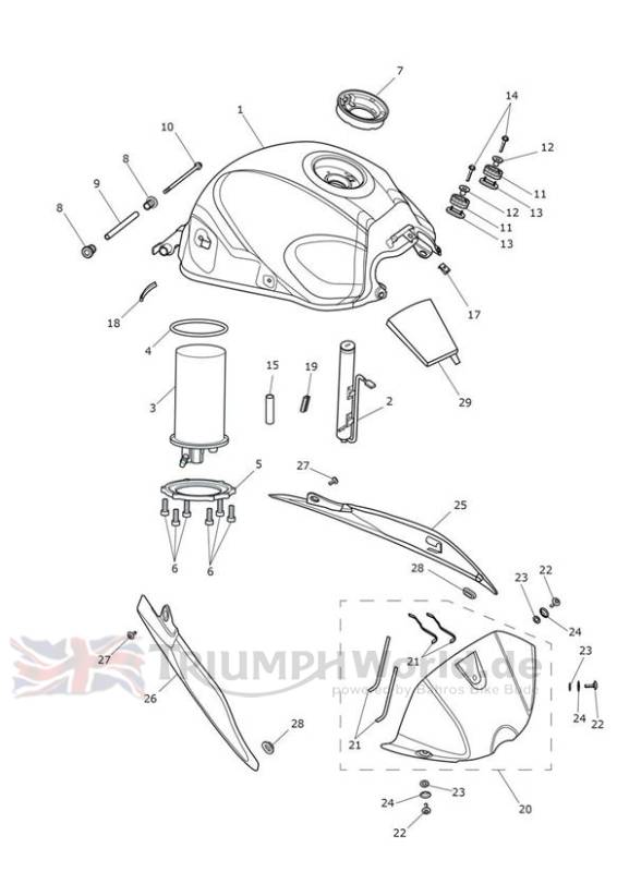 | 1 | ![]() T2401387-NW | Fuel Tank Assy | 1 | Crystal White - Includes heat pad, item 29 & tank badges, item 30 |
