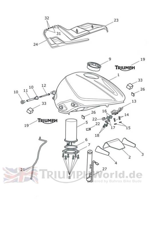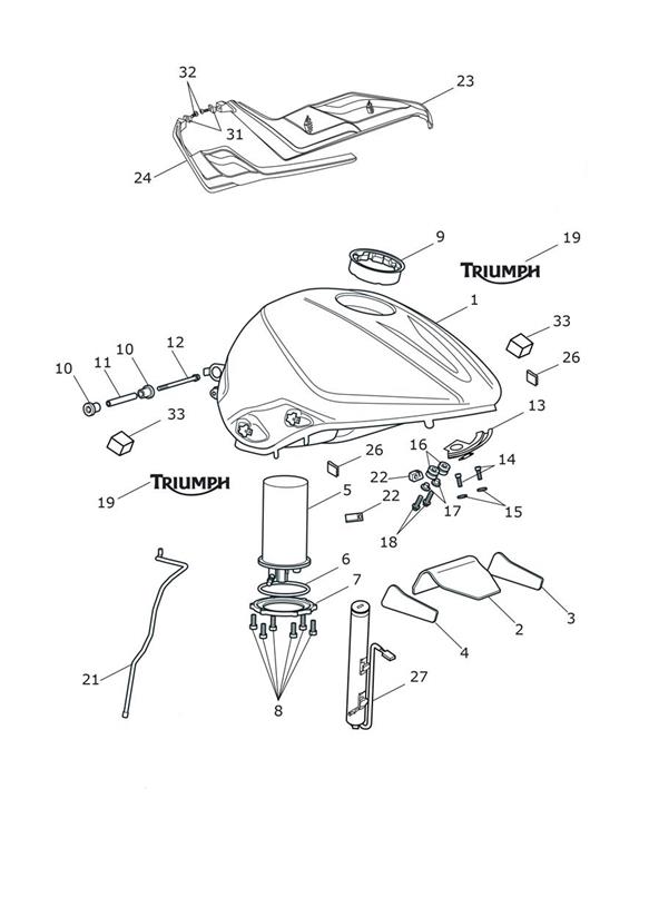 | 1 | ![]() T2401438-CW | Fuel Tank Spares Assembly | 1 | > 898812 - Diablo Red - Includes Heat Pads, items 2,3,4; & Badges, item 19 |