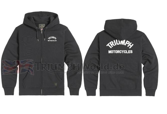 Schwarzer Herren-Zip-Hoody mit kleinem elfenbeinfarbenen Triumph Motorcycles Schriftzug vorn und in großer Version auf dem Rücken