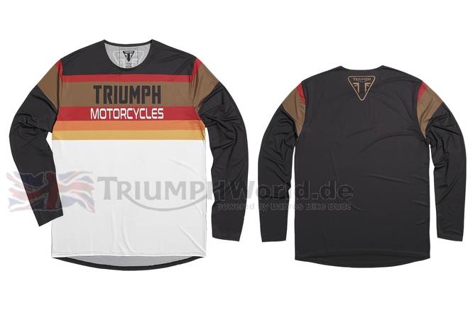 Schwarz-rot-weißes Triumph Jersey aus innovativem, ultraleichtem und elastischem Polyester-Netzgewebe mit einem geformten Rückenteil für eine sichere und komfortable Passform und elastischen Bündchen. Stilisierter, sublimierter Druck mit Triumph Motorcycles-Schriftzug im Brustbereich.