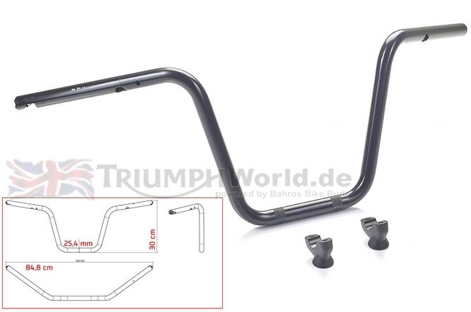 Das Ape-Hanger Lenkerkit enthält einen schwarzen hohen Lenker und dunkle Riser mit passenden Fixierungsstiften für die Bohrungen im Lenker.