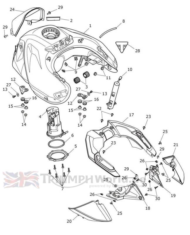 | 1 | ![]() T2403549-NM | Fuel Tank Assembly, Snowdonia White | 1 | Includes 2 x decals item 28,4 x locknuts item 14 & 4 x clips item 9 |