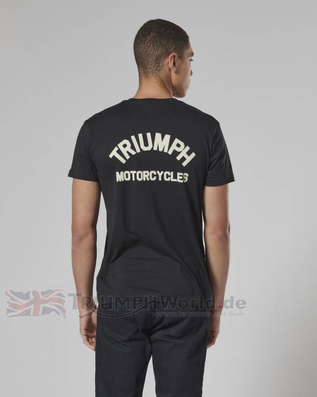 schwarzes T-Schirt mit weißem Triumph Motorcycles Schriftzug auf dem Rücken.